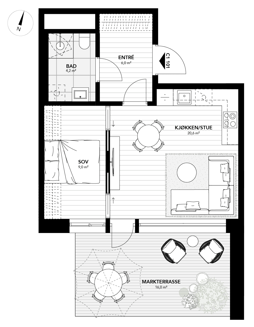 Attraktiv 2-roms leilighet med meget god planløsning og entré med god plass til garderobe. Leiligheten får en åpen stue- og kjøkkenløsning med god plass til både sofahjørne og spisebord. Fra stuen er det utgang til stor markterrasse hvor du kan nyte fine sommerdager. Soverommet har god plass til dobbeltseng og garderobe. Leiligheten får et delikat flislagt bad med wc, servant, dusjhjørne og opplegg for vaskemaskin.