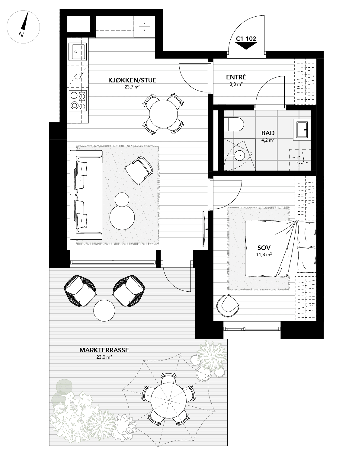 Attraktiv 2-roms leilighet med meget god planløsning og en innbydende entré med god plass til garderobe. Leiligheten får en åpen stue- og kjøkkenløsning med god plass til både sofahjørne og spisebord. Fra stuen er det utgang til stor markterrasse hvor du kan nyte fine sommerdager. Soverommet har god plass til dobbeltseng og garderobe. Leiligheten får et delikat flislagt bad med wc, servant, dusjhjørne og opplegg for vaskemaskin.