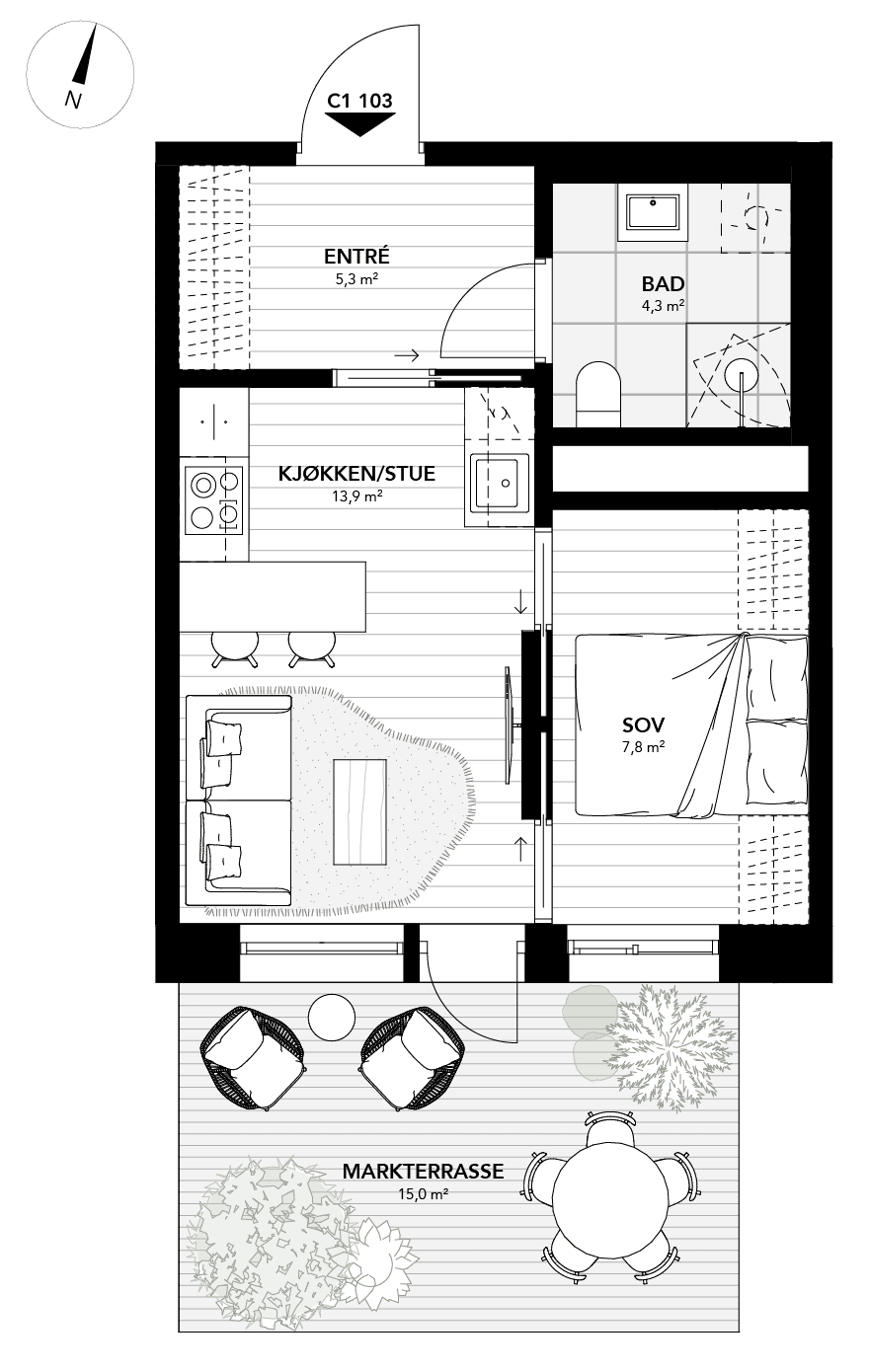 Effektiv 2-roms leilighet med god planløsning og en innbydende entré med plass til garderobe. Leiligheten får en åpen stue- og kjøkkenløsning. Barløsning med sitteplasser på kjøkken. Leiligheten får takhøyde på hele 3,8 meter. Fra stuen er det utgang til stor markterrasse hvor du kan nyte fine sommerdager. Soverommet har god plass til dobbeltseng og garderobe. Leiligheten får et delikat flislagt bad med wc, servant, dusjhjørne og opplegg for vaskemaskin.