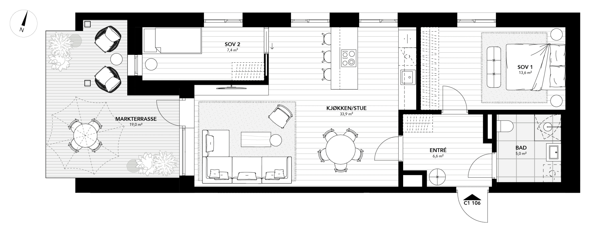 Lekker og lys 3-roms hjørneleilighet med markterrasse og god planløsning. Leiligheten har entré med god plass til garderobe og møblement. Åpen stue- og kjøkkenløsning. Kjøkkenøy med integert koketopp og barløsning med sitteplasser. Gode møbleringsmuligheter for egen sofa- og TV avdeling. Leiligheten får takhøyde på hele 3,8 meter. Leiligheten har to komfortable soverom, med plass til dobbeltseng og garderobe på hovedsoverommet. Delikat flislagt bad med dusjhjørnet, toalett, servant og opplegg for vaskemaskin.