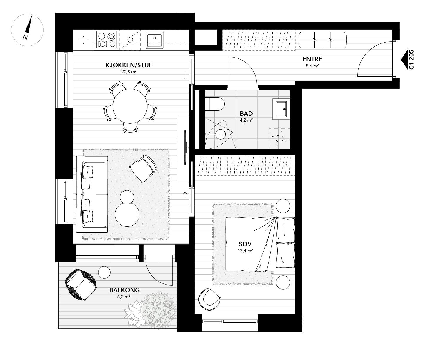 Stor og attraktiv 2-roms hjørneleilighet med god planløsning. Leiligheten har en innbydende stor entré med plass til garderobe og møblement. Åpen stue- og kjøkkenløsning med fine møbleringsmuligheter og store vindusflater som gir godt lysinnslipp. Fra stuen er det utgang til sydvendt balkong. Soverommet er romslig og har god plass til dobbeltseng og garderobe. Lekkert flislagt bad med wc, servant, dusjhjørne og opplegg for vaskemaskin.