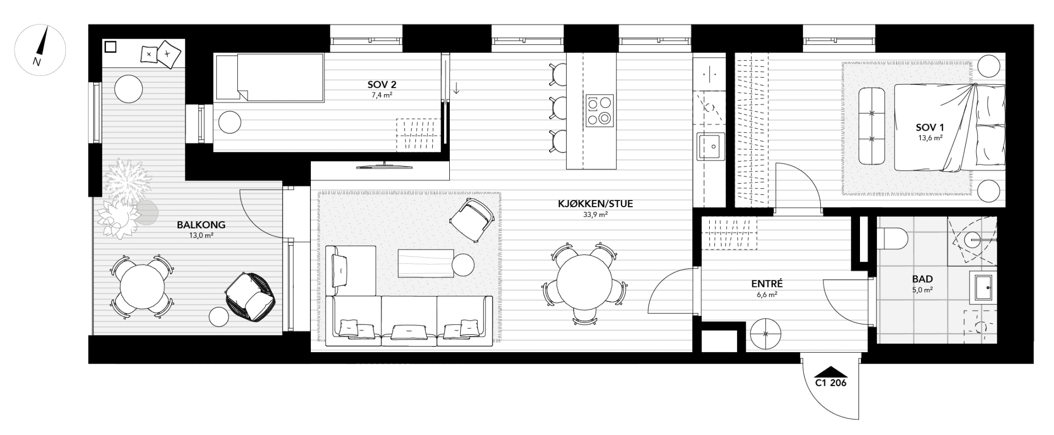 Flott 3-roms hjørneleilighet med god planløsning. Leiligheten har en innbydende entré med plass til garderobe. Leiligheten har en åpen stue- og kjøkkenløsning med fine møbleringsmuligheter, kjøkkenøy med integert koketopp og barløsning med sitteplasser. Fra stuen har du utgang til stor vestvendt balkong. Leiligheten får to flotte soverom, ett av dem har god plass til dobbeltseng og garderobe. Delikat flislagt bad med wc, servant, dusjhjørne og opplegg for vaskemaskin.