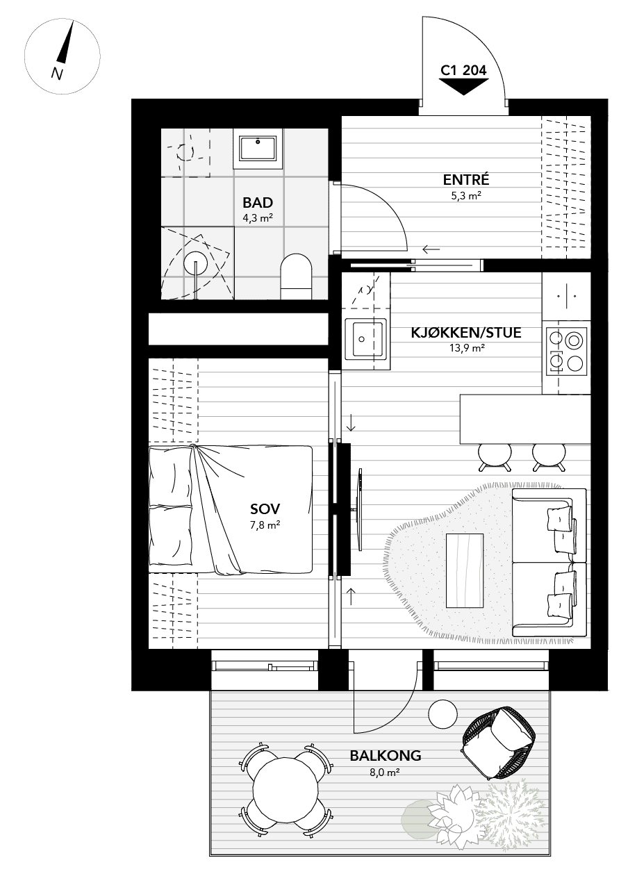 Effektiv 2-roms leilighet med fin planløsning og entré med god plass til garderobe. Leiligheten får en åpen stue- og kjøkkenløsning. Barløsning med sitteplasser i tilknytning til kjøkken. Fra stuen er det utgang til sydvendt balkong hvor du kan nyte morgenkaffen eller fine sommerdager. Soverommet er romslig og har god plass til dobbeltseng og garderobe. Leiligheten får et delikat flislagt bad med wc, servant, dusjhjørne og opplegg for vaskemaskin.