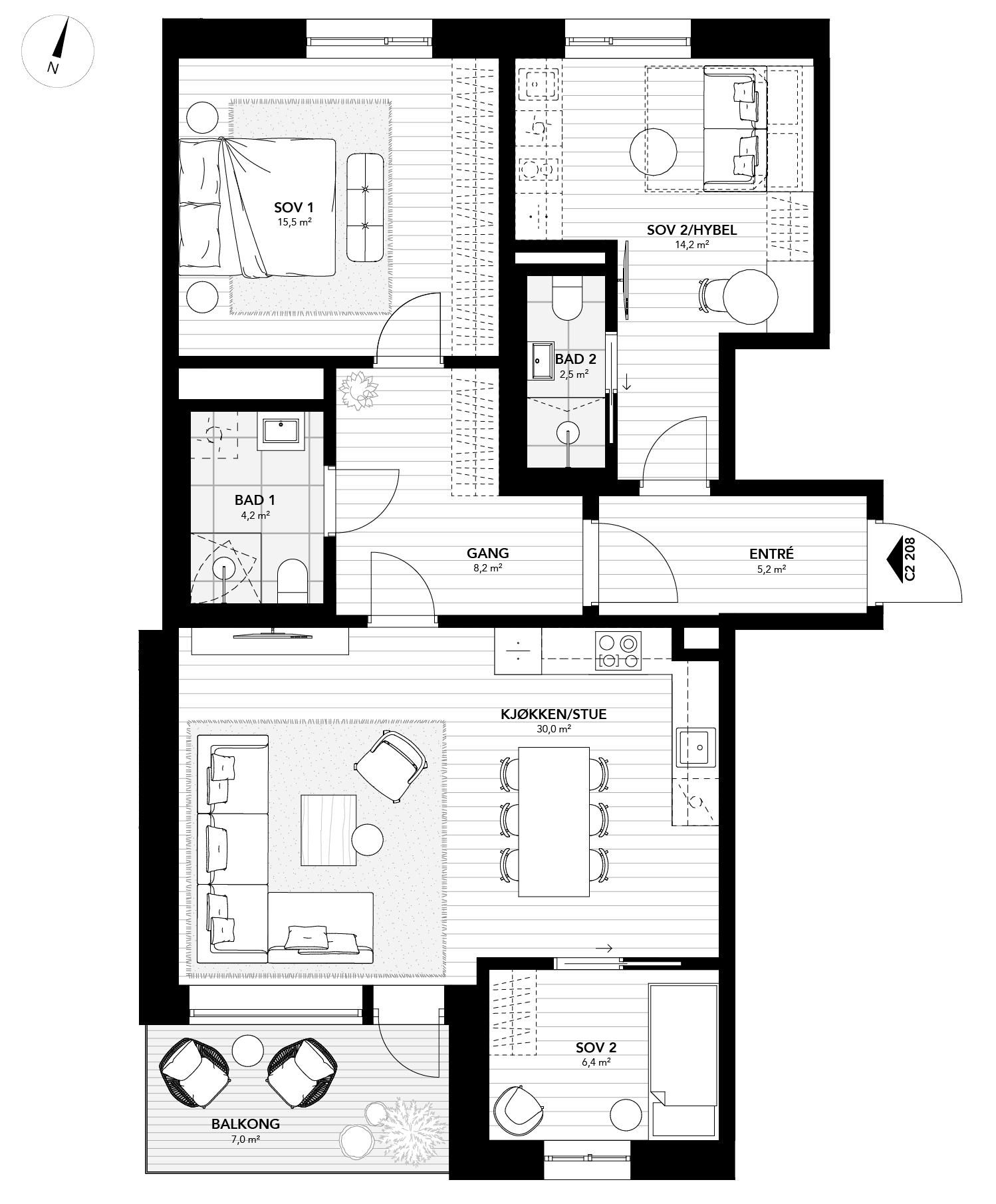 Attraktiv fleksibel 4-roms leilighet med mulighet for hybel. Leiligheten har tre soverom, hvorav to soverom med god plass til dobbeltseng og garderobe. Stor åpen stue- og kjøkkenløsning med utgang til sydvendt balkong. Lekkert flislagt bad. Hybelen eller det tredje soverommet har i tillegg eget bad, med wc, servant og dusjhjørnet, samt opplegg for vaskemaskin.