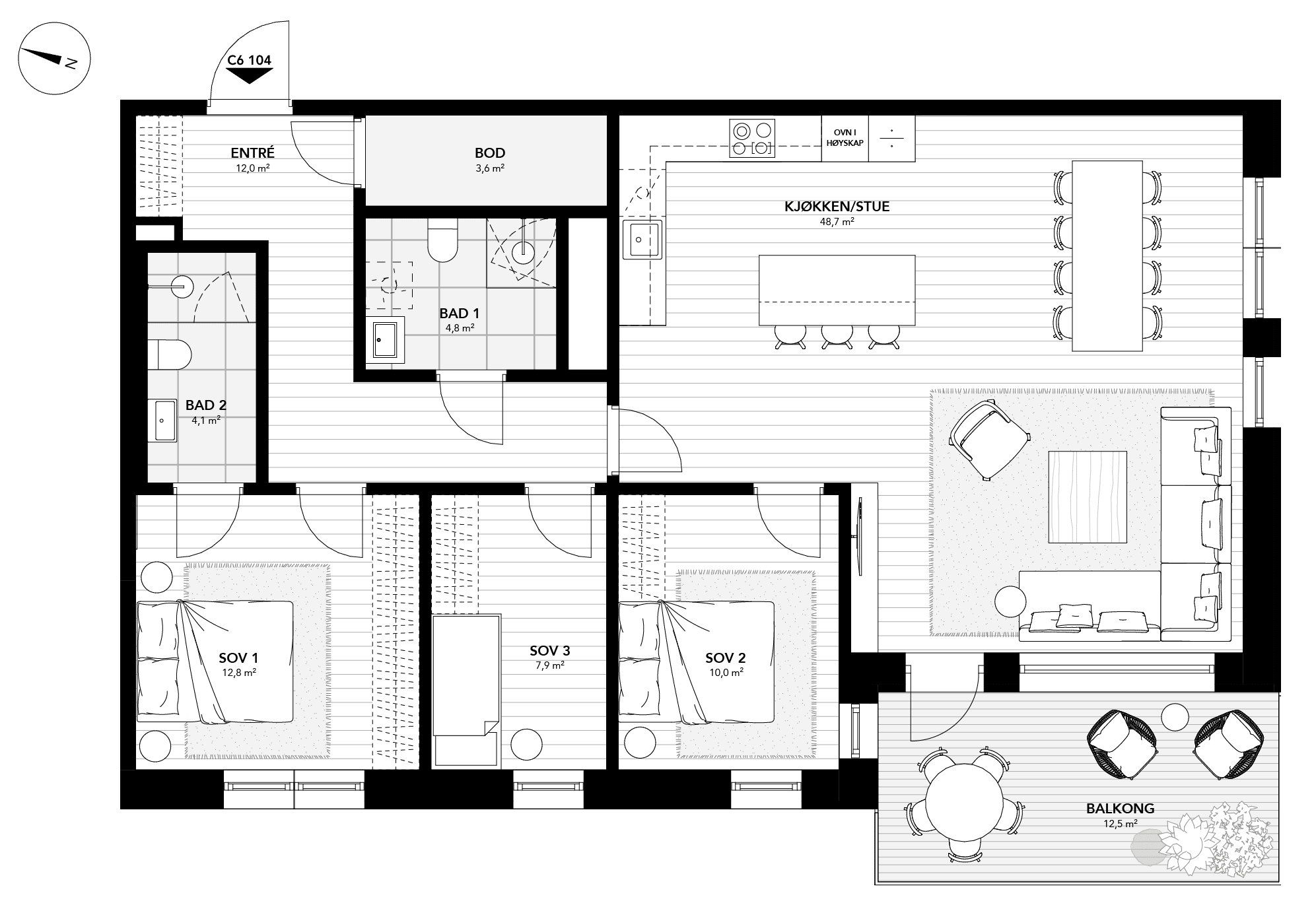 Stor 4-roms hjørneleilighet med sydvestvendt markterrasse. Entré med avsatt plass til garderobe. Romslig og luftig stue med god plass til sofahjørne og TV, samt spisestue i kombinasjon med åpen kjøkkenløsning med øy. Leiligheten har tre soverom, med god plass til dobbeltseng på hovedsoverommet. Plass til garderobe på alle soverom. Leiligheten har to delikate bad, med dusjhjørnet, toalett og servant, samt opplegg for vaskemaskin på det største badet. Hovedsoverom har direkte tilgang til eget bad. Leiligheten har i tillegg en praktisk innvendig bod.