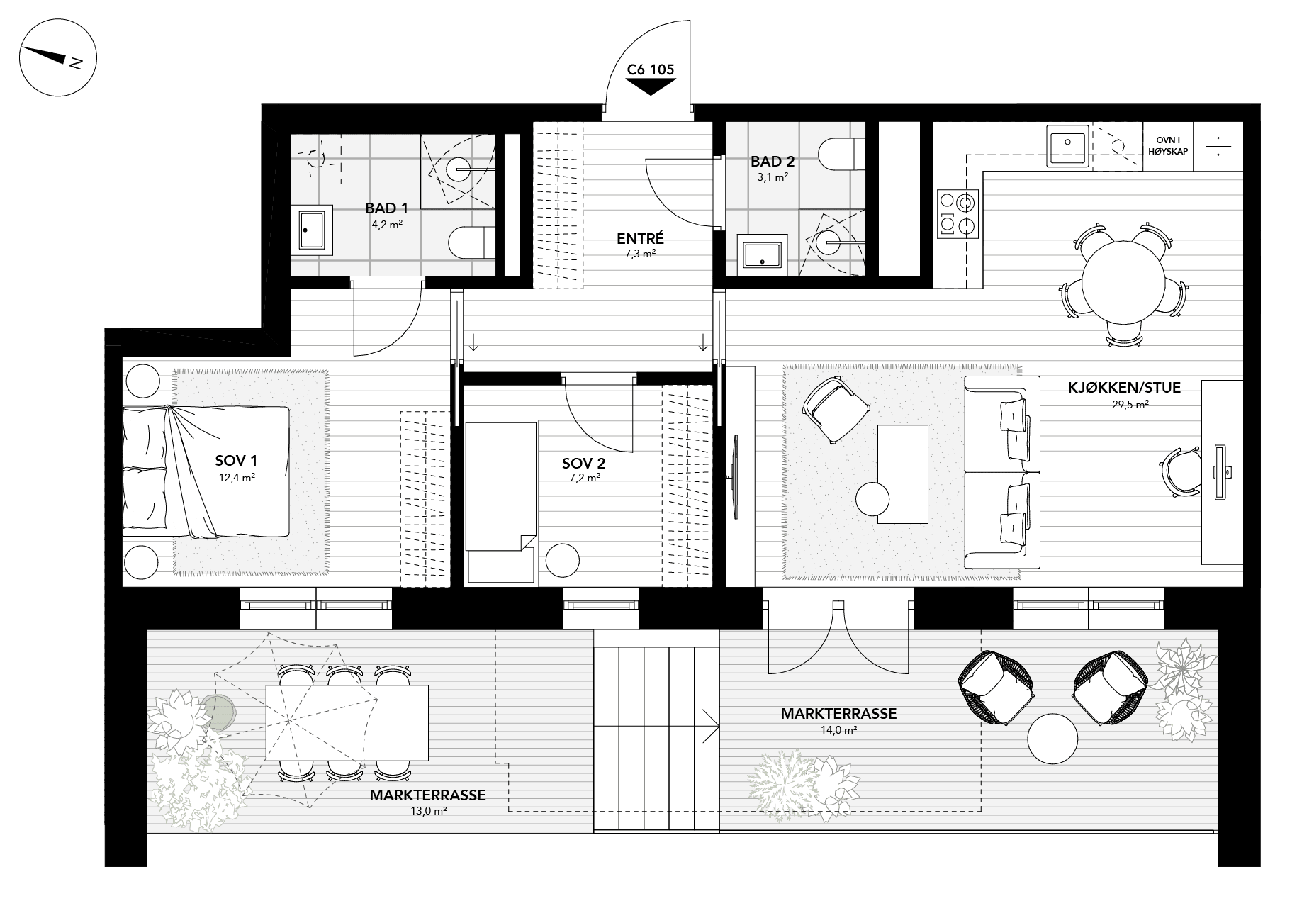 Lekker 3-roms leilighet med vestvendt markterrasse og god planløsning. Leiligheten har en entré med plass til garderobe. Åpen stue- og kjøkkenløsning med god plass til både sofahjørne og spisebord. Leiligheten har to komfortable soverom, med plass til dobbeltseng og garderobe på hovedsoverommet. To delikate flislagte bad med dusjhjørnet, toalett og servant. Det ene badet har direkte adkomst fra hovedsoverommet.