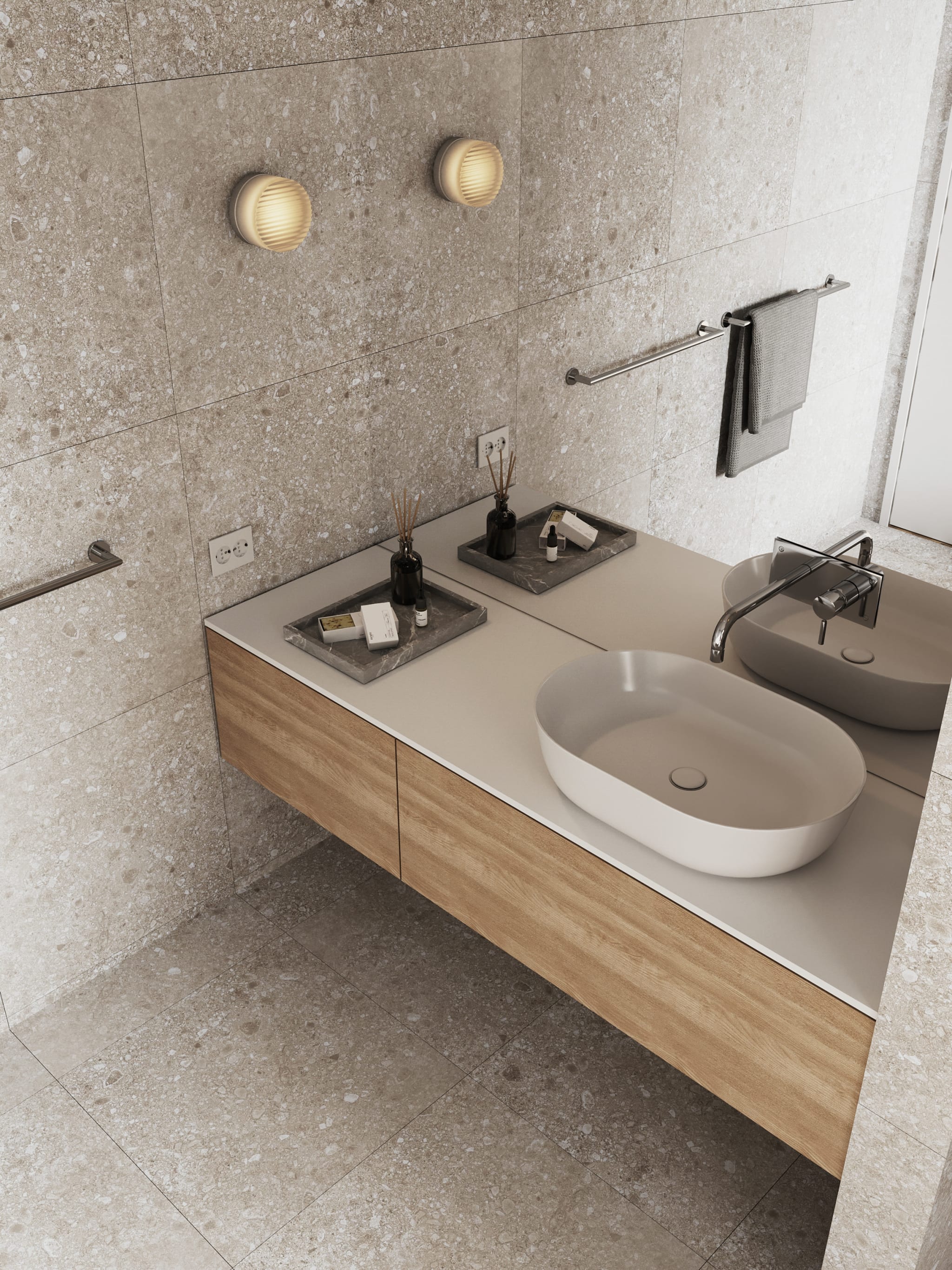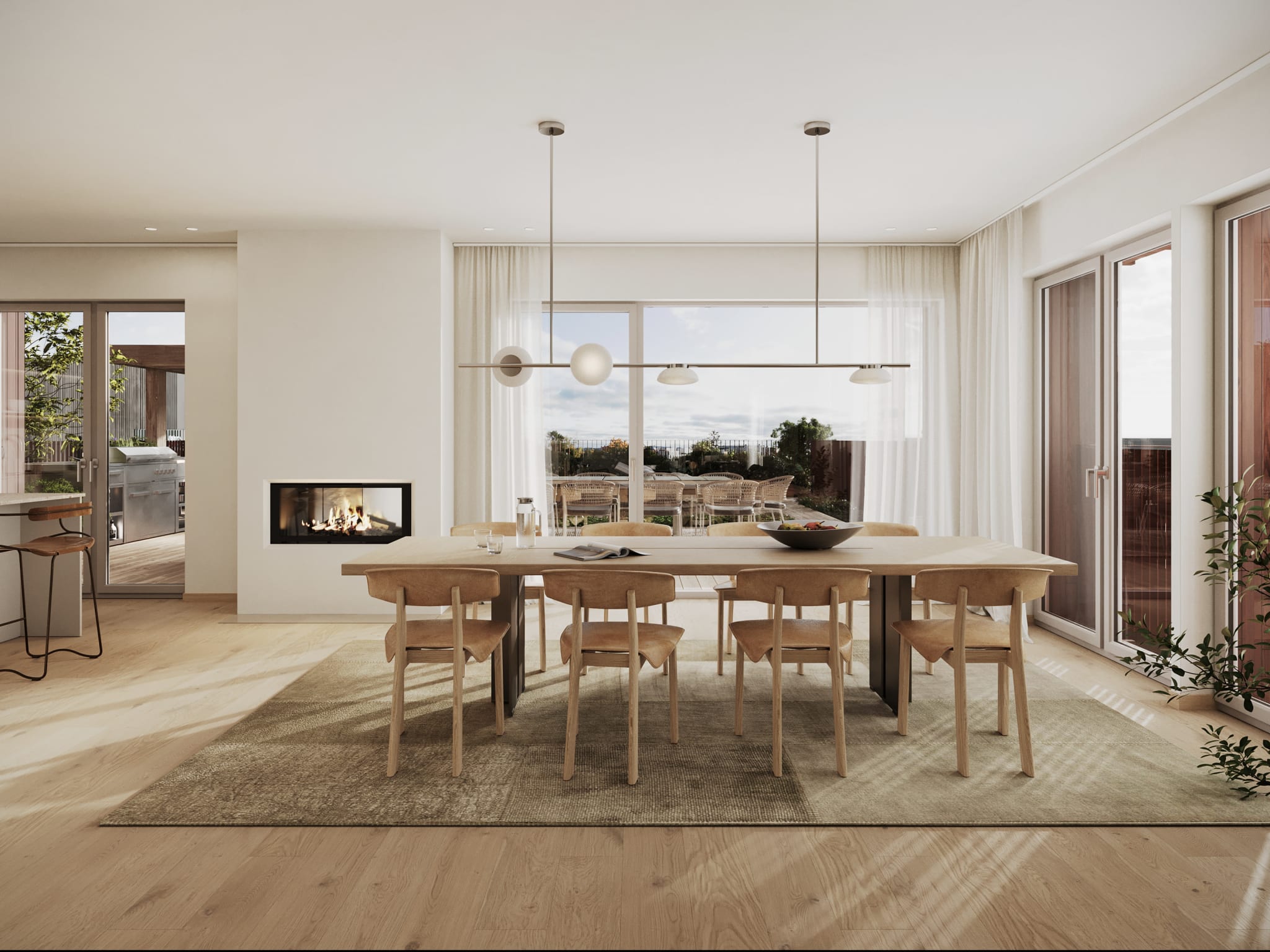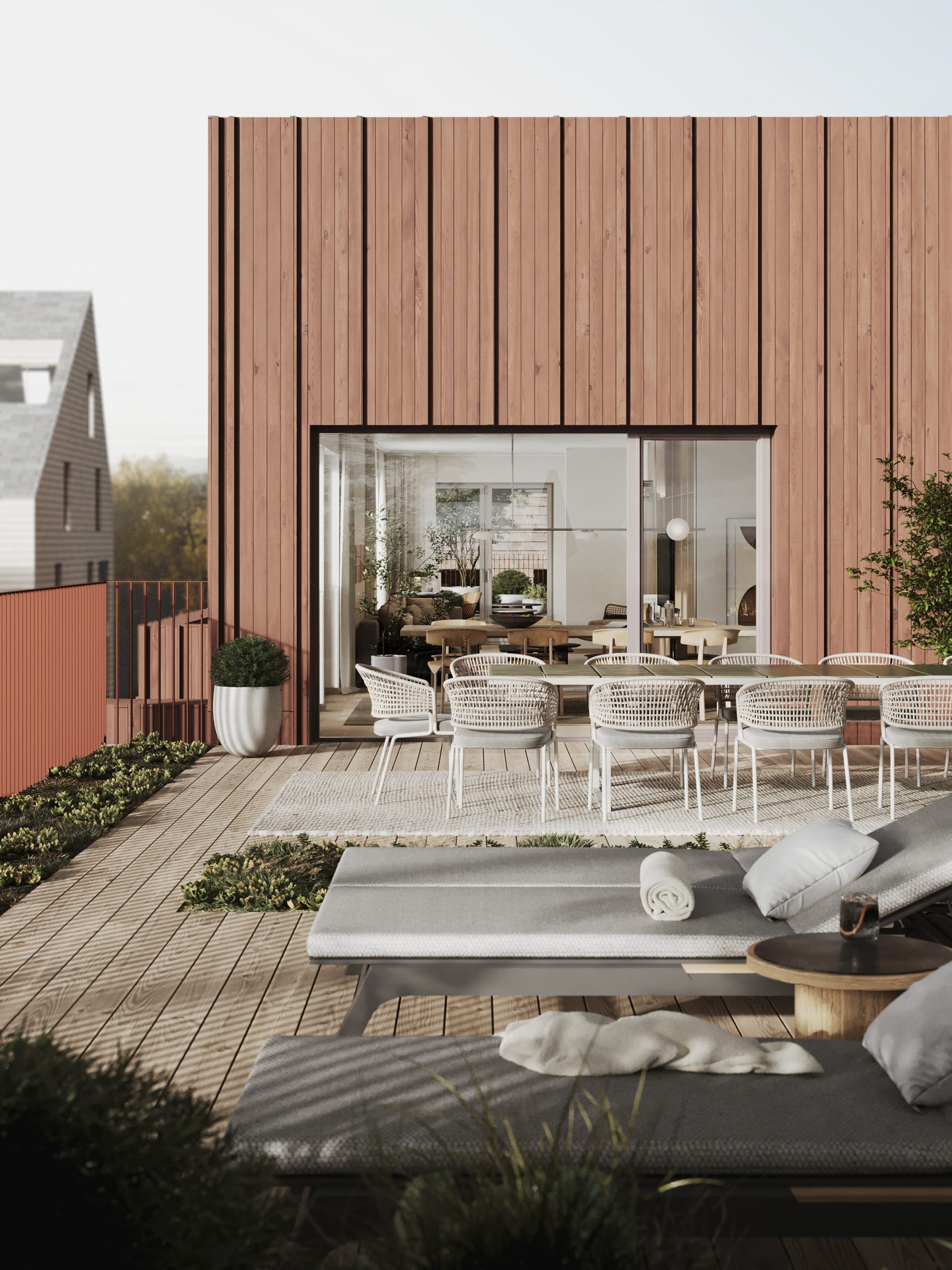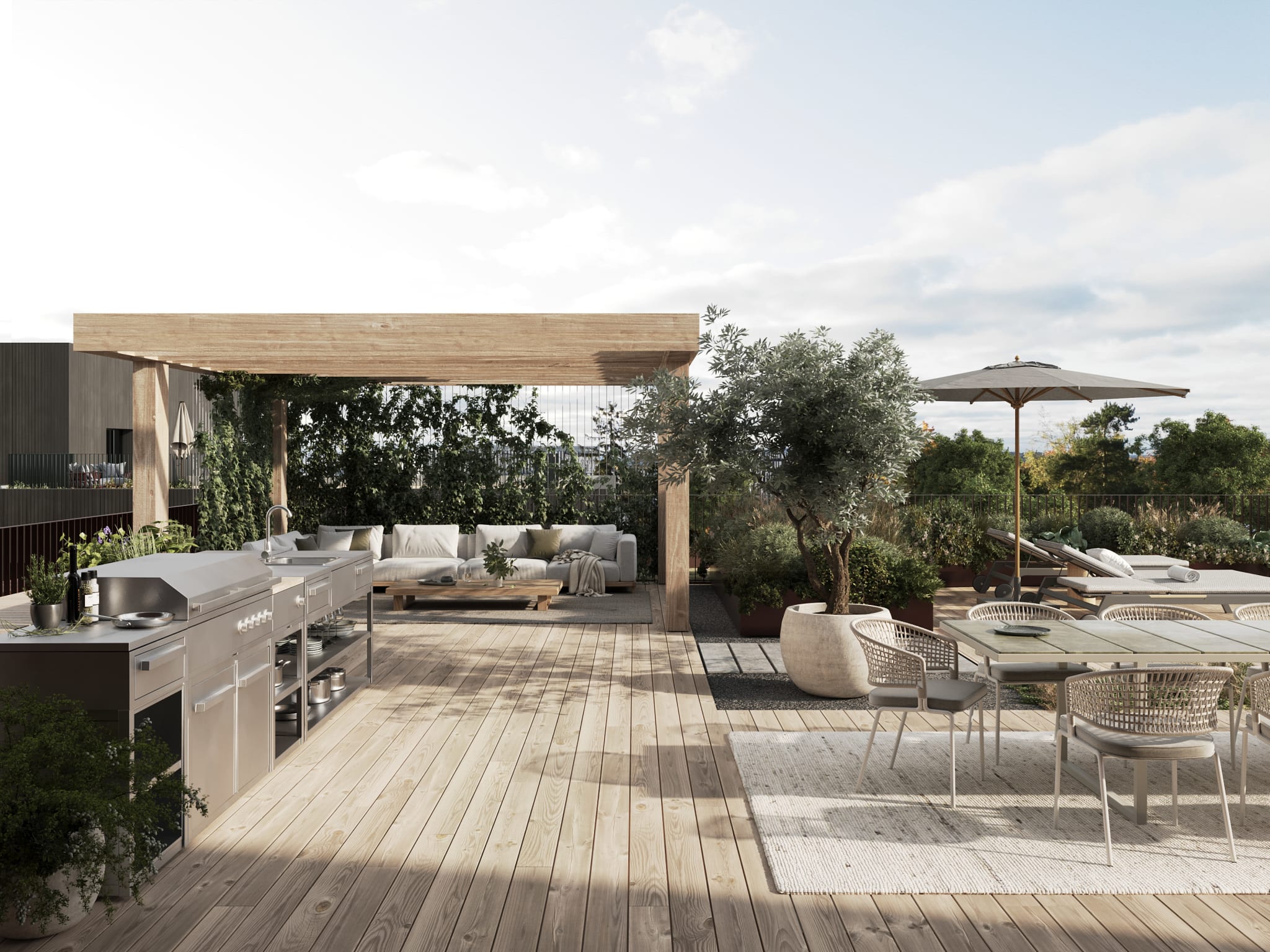 Stor 4-roms toppleilighet med vinduer på alle sider og to store takterrasser på ca. 147 og 129 m 2 , med kvaliteter som utekjøkken, pergola, frodig beplantning, flere sosiale soner til både soling, avslapping og hyggelige måltider. Leiligheten får eksklusiv adkomst med heis direkte inn i leiligheten. Videre får den et lekkert kjøkken med øy og god plass til spisebord. Fra kjøkkenet får du direkte utgang til takterrasse med utekjøkken. Stuen får god plass til sofagruppe og utgang til den andre takterrassen, som blir en naturlig forlengelse av stuen. Leiligheten inneholder tre soverom med god størrelse og avsatt plass til garderobe. Hovedsoverommet får adkomst via en egen gang med mulighet for å etablere walk-in garderobe, samt et eget bad med badekar. Begge badene i leiligheten får delikate storformat fliser. I gangen er det gjestetoalett og et praktisk vaskerom med innredning. Denne leiligheten gir deg anledning til å beholde kvalitetene til en enebolig med hage - i form av en stor toppleilighet med to rause takterrasser.