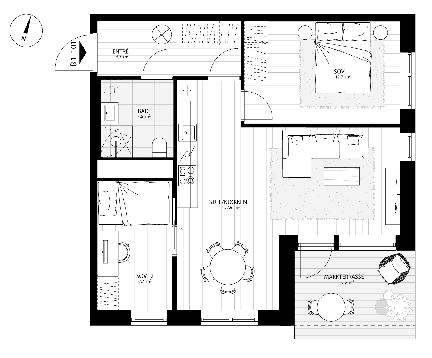 Attraktiv leilighet med åpen stue- og kjøkkenløsning. Leiligheten får takhøyde på hele 3,4 meter som skaper en luftig atmosfære. Fra stuen har du utgang til en stor markterrasse. Hovedsoverom med god plass til dobbeltseng og garderobe, samt et ekstra soverom som passer til gjesterom, kontor eller barnerom. Leiligheten får et delikate bad med wc, servant, dusjhjørne og opplegg for vaskemaskin.