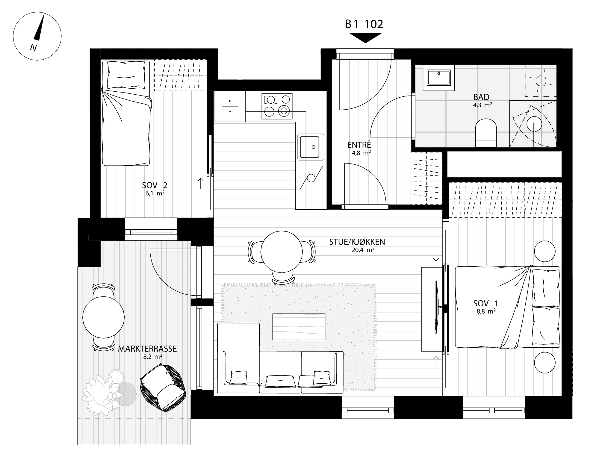 Arealeffektiv og innbydende 3-roms med åpen stue- og kjøkkenløsning med direkte utgang til markterrasse. Leiligheten får takhøyde på hele 3,4 meter som skaper en luftig atmosfære. Her får du en funksjonell planløsning med to soverom. Hovedsoverom med god plass til dobbeltseng og garderobe. Bad med delikate fliser med wc, servant, dusjhjørne og opplegg for vaskemaskin.