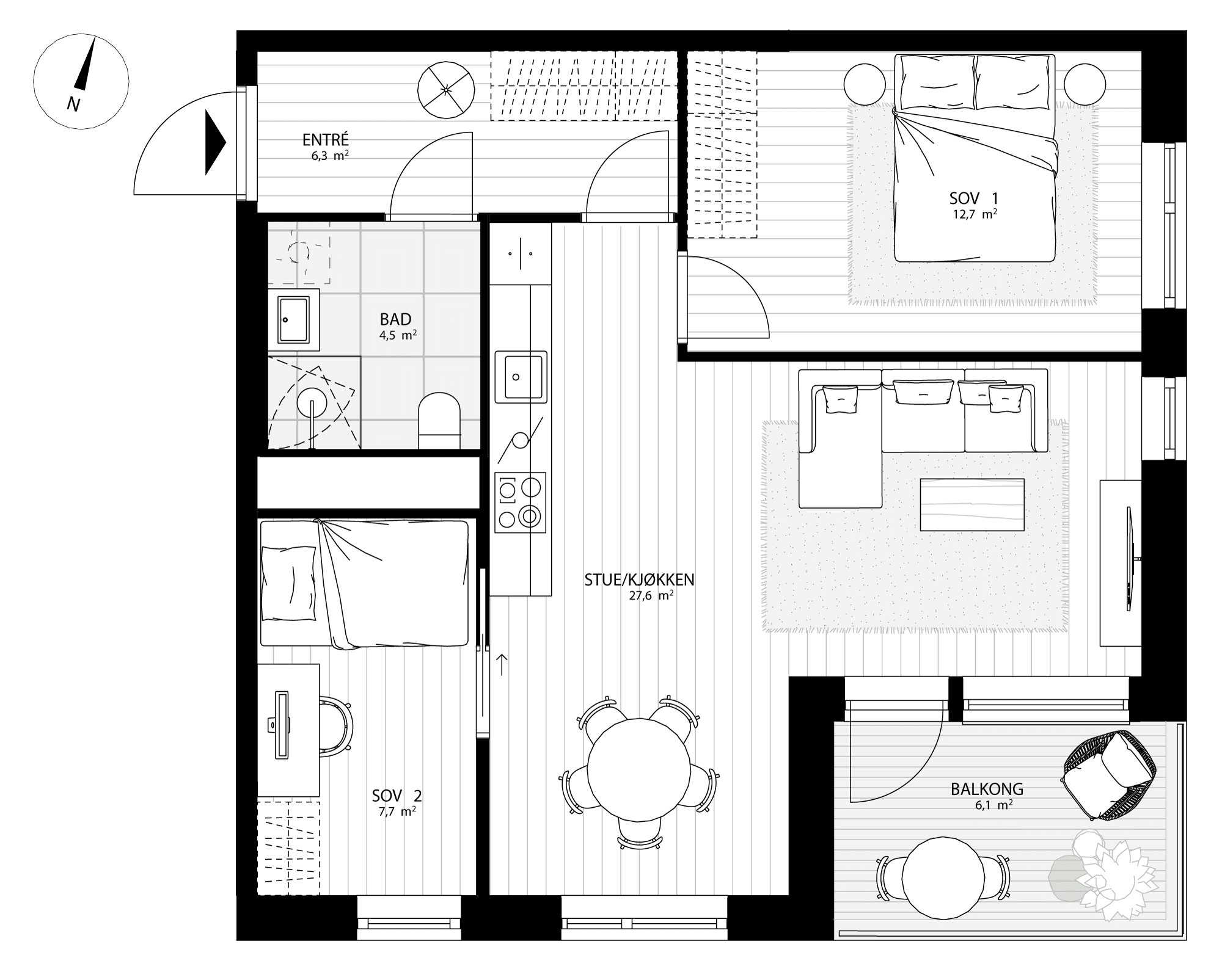 Innbydende 3-roms leilighet med åpen stue- og kjøkken med en lys og luftig atmosfære. Fra stuen har du utgang til balkong. Romslig hovedsoverom med plass til nattbord og garderobe. Soverom to fungere godt som gjesterom eller kontor. Bad med delikate fliser med wc, servant, dusjhjørne og opplegg for vaskemaskin.