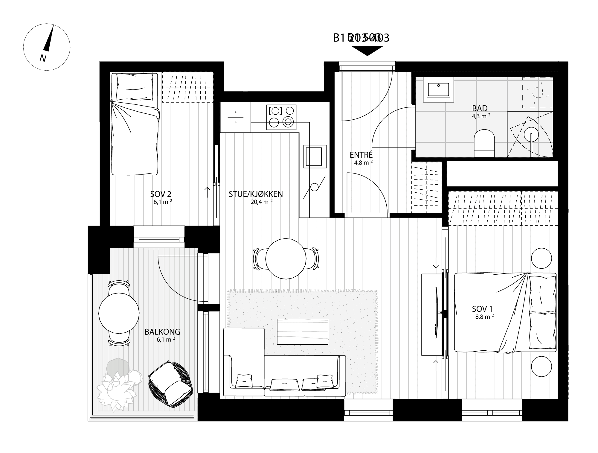 Arealeffektiv og innbydende 3-roms med åpen stue- og kjøkkenløsning med direkte utgang til balkong. Her får du en funksjonell planløsning med to soverom. Hovedsoverom med god plass til dobbeltseng og garderobe. Bad med delikate fliser med wc, servant, dusjhjørne og opplegg for vaskemaskin.