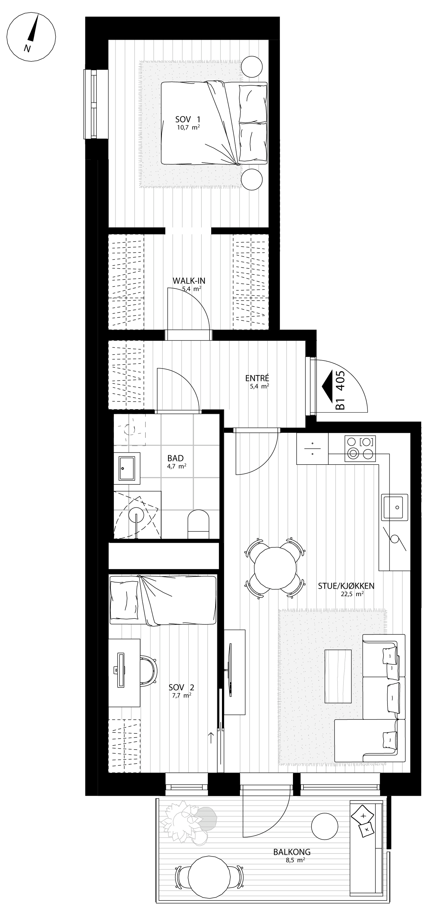 Innbydende og praktisk 3-roms leilighet med rikelig med garderobe- og oppbevaringsplass som gjør hverdagen praktisk. Leiligheten har åpen stue- og kjøkkenløsning med utgang til en koselig balkong. Romslig hovedsoverom med egen walk-in garderobe. Soverom to med med plass til skirvebord. Bad med delikate fliser med wc, servant, dusjhjørne og opplegg for vaskemaskin.