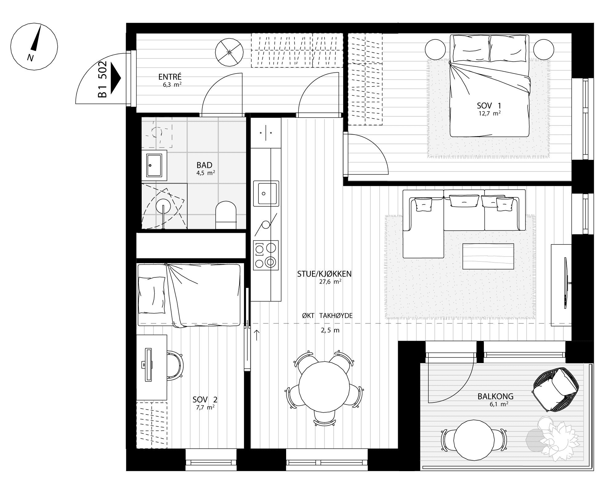 Innbydende 3-roms leilighet med åpen stue- og kjøkken med en lys og luftig atmosfære. Fra stuen har du utgang til balkong. Romslig hovedsoverom med plass til nattbord og garderobe. Soverom to fungere godt som gjesterom eller kontor. Bad med delikate fliser med wc, servant, dusjhjørne og opplegg for vaskemaskin.
