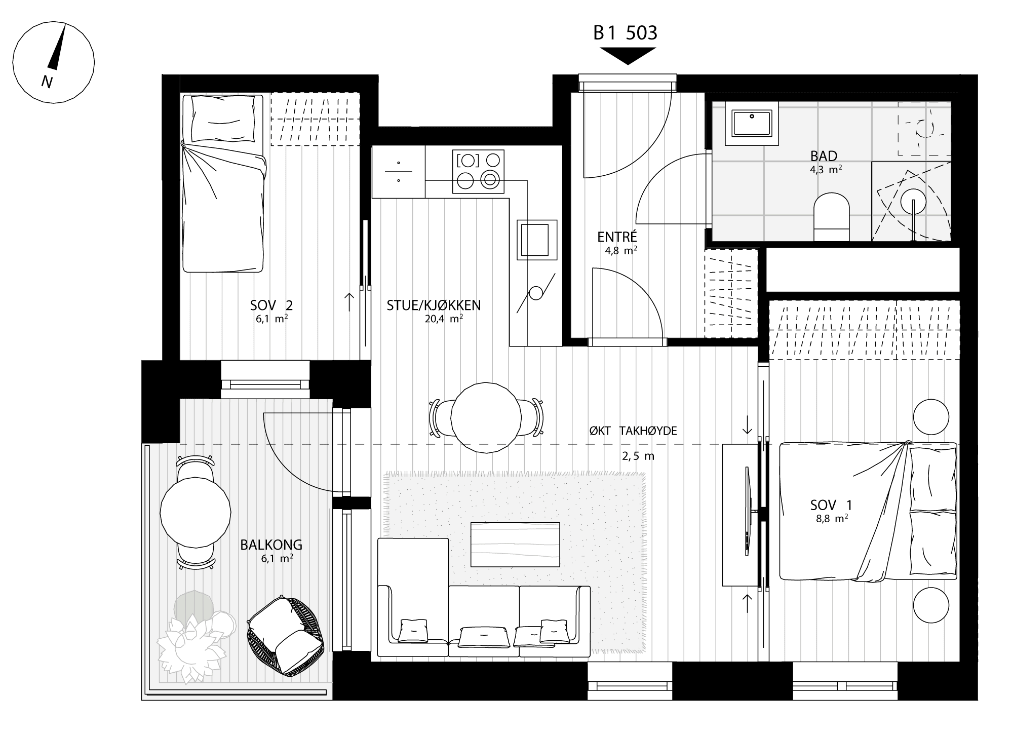 Arealeffektiv og innbydende 3-roms med åpen stue- og kjøkkenløsning med direkte utgang til balkong. Her får du en funksjonell planløsning med to soverom. Hovedsoverom med god plass til dobbeltseng og garderobe. Bad med delikate fliser med wc, servant, dusjhjørne og opplegg for vaskemaskin.