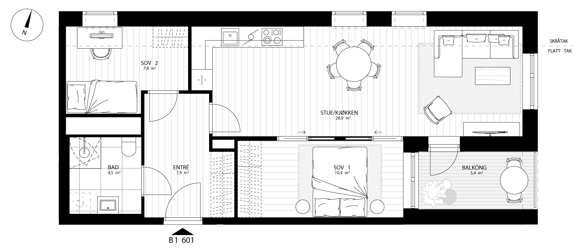 Romslig og innbydende 2-roms leilighet med åpen stue- og kjøkken med øy. Leilighten får takhøyde på 2,9 meter og skråtak. Fra stuen har du utgang til en fin markterrasse med plass til spsiebord og sittegruppe. Et komfortabelt og romslig soverom. Bad med delikate fliser med wc, servant, dusjhjørne og opplegg for vaskemaskin.