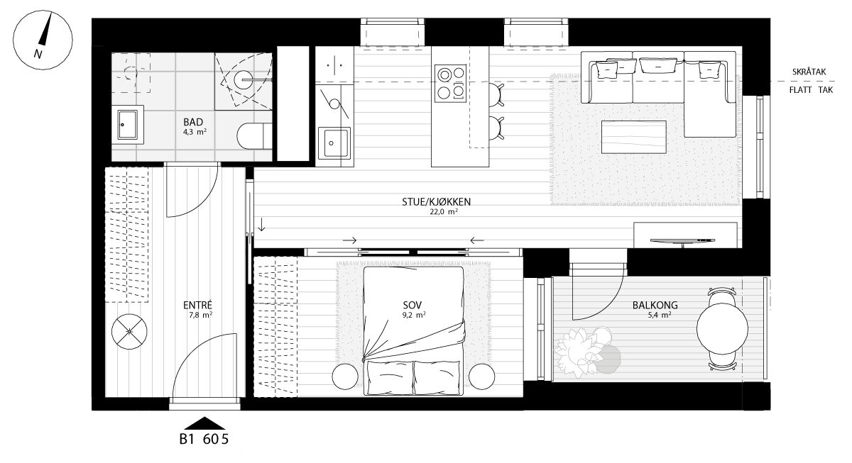 Innbydende 2-roms leilighet med åpen stue- og kjøkken med øy. Leiligheten får en lys og luftig atmosfære med takhøyde på 2,9 menter og skråtak. Fra stuen har du utgang til balkong. Et komfortabelt og romslig soverom med plass til garderobe. Bad med delikate fliser med wc, servant, dusjhjørne og opplegg for vaskemaskin.