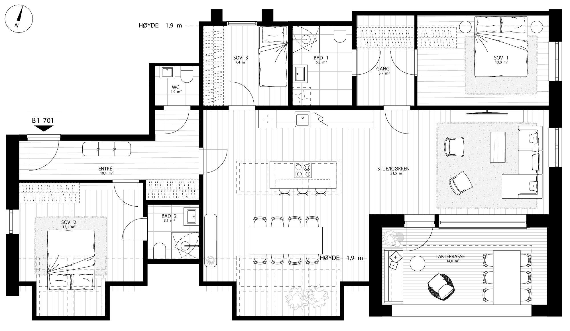 Attraktiv og sjelden 4-roms toppleilighet i byggets toppetasje. Denne leiligheten er bra utnyttet og gir en følelse av eksklusivitet. Boligen har en fantastisk åpen stue- og kjøkkenløsning med øy. Leiligheten får imponerende ekstra takhøyde som varier opp mot 4,5 meter. Sjenerøse takterrasse med god plass til møblering. Leiligheten har en meget funksjonell utforming med hele tre soverom, to av dem med bad i nær tilknytning, i tillegg til et separat WC. Dette er et velutstyrt drømmehjem som kombinerer romslighet, funksjonalitet og en unik toppetasjeopplevelse.