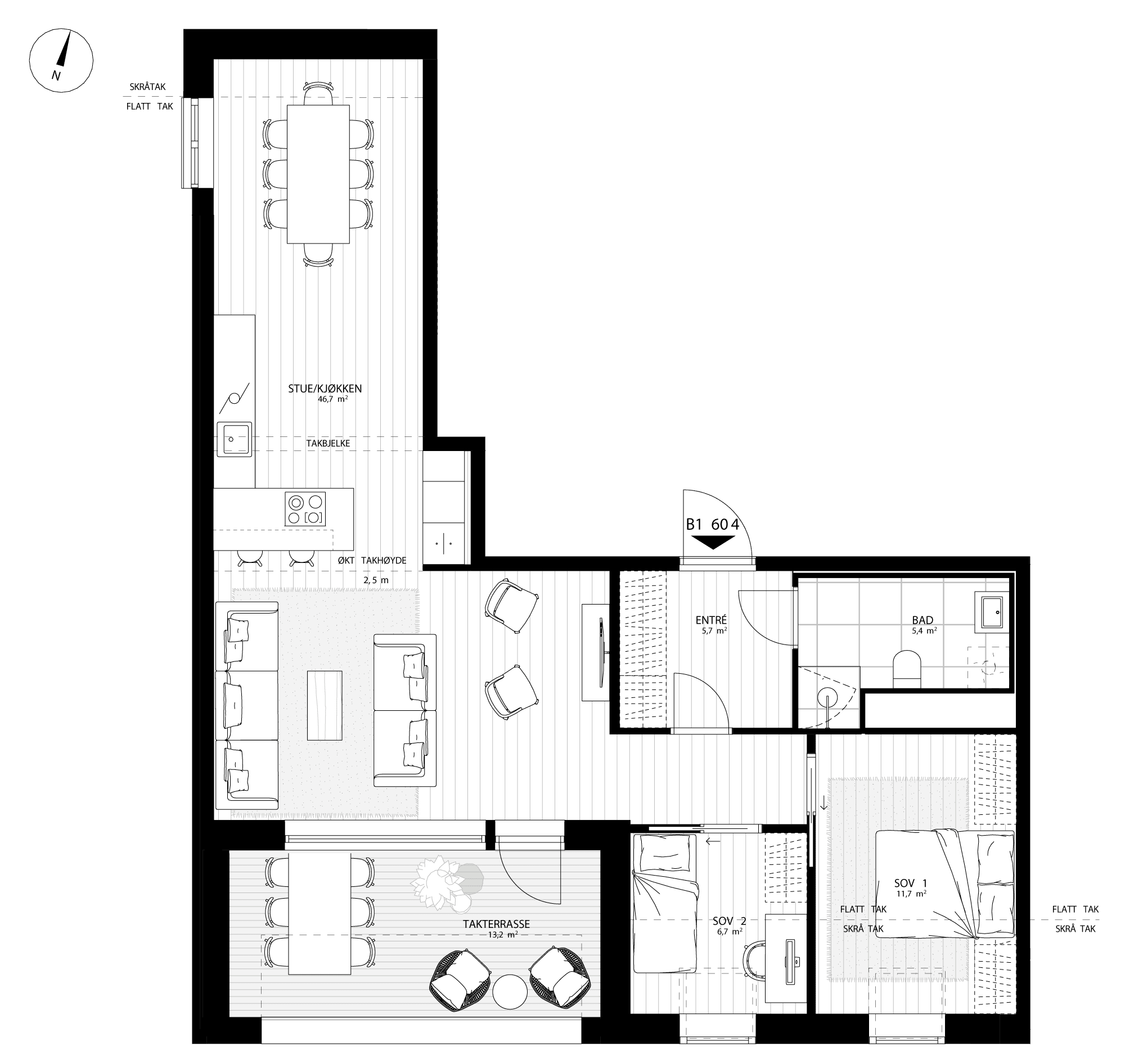 Attraktiv og romslig 3-roms leilighet. Dette er en toppleilighet som er effektivt utformet og som byr på en lekker privat takterrasse. Leiligheten har en stor og åpen stue- og kjøkkenløsning som samtidig er skjermet i hver sin ende. I leilighten får du økt takhøyde og skråtak, noe som skaper en lys og luftig atmosfære. Kjøkkenet er smart integrert og gir god plass til en stor spiseplass. Boligen har to separate soverom og et delikat bad.