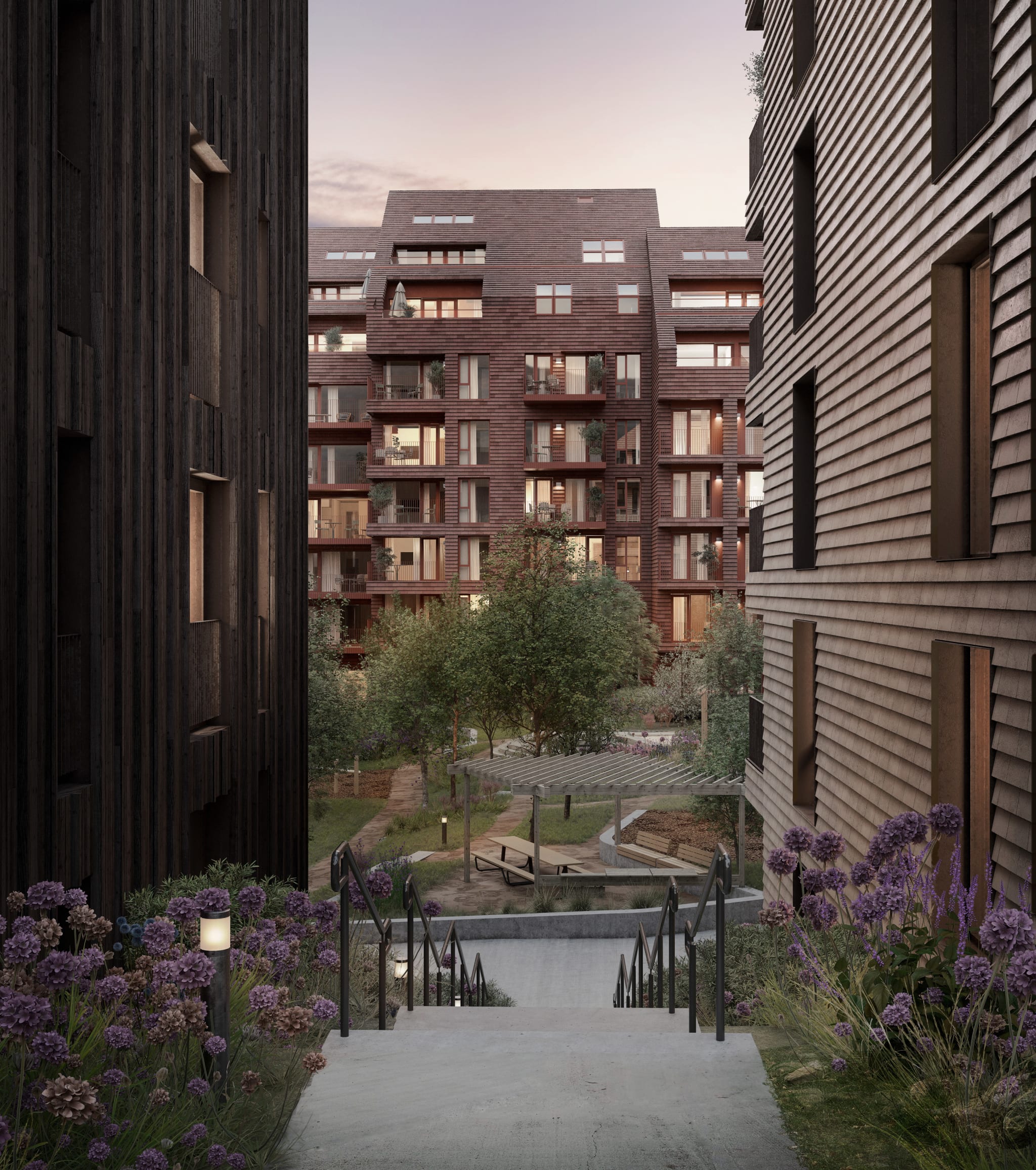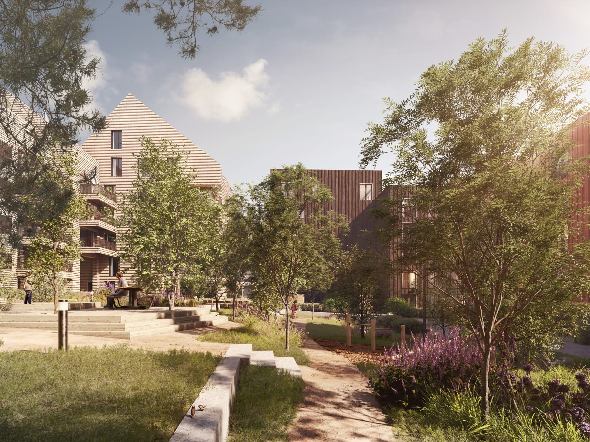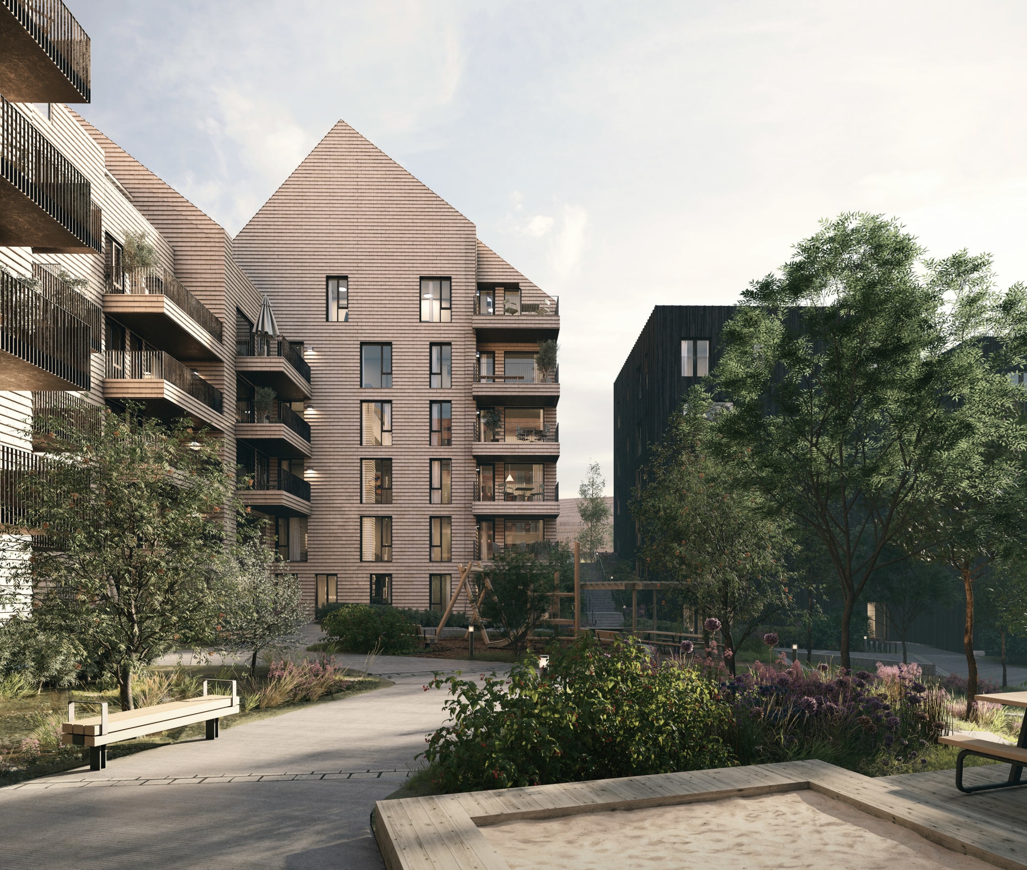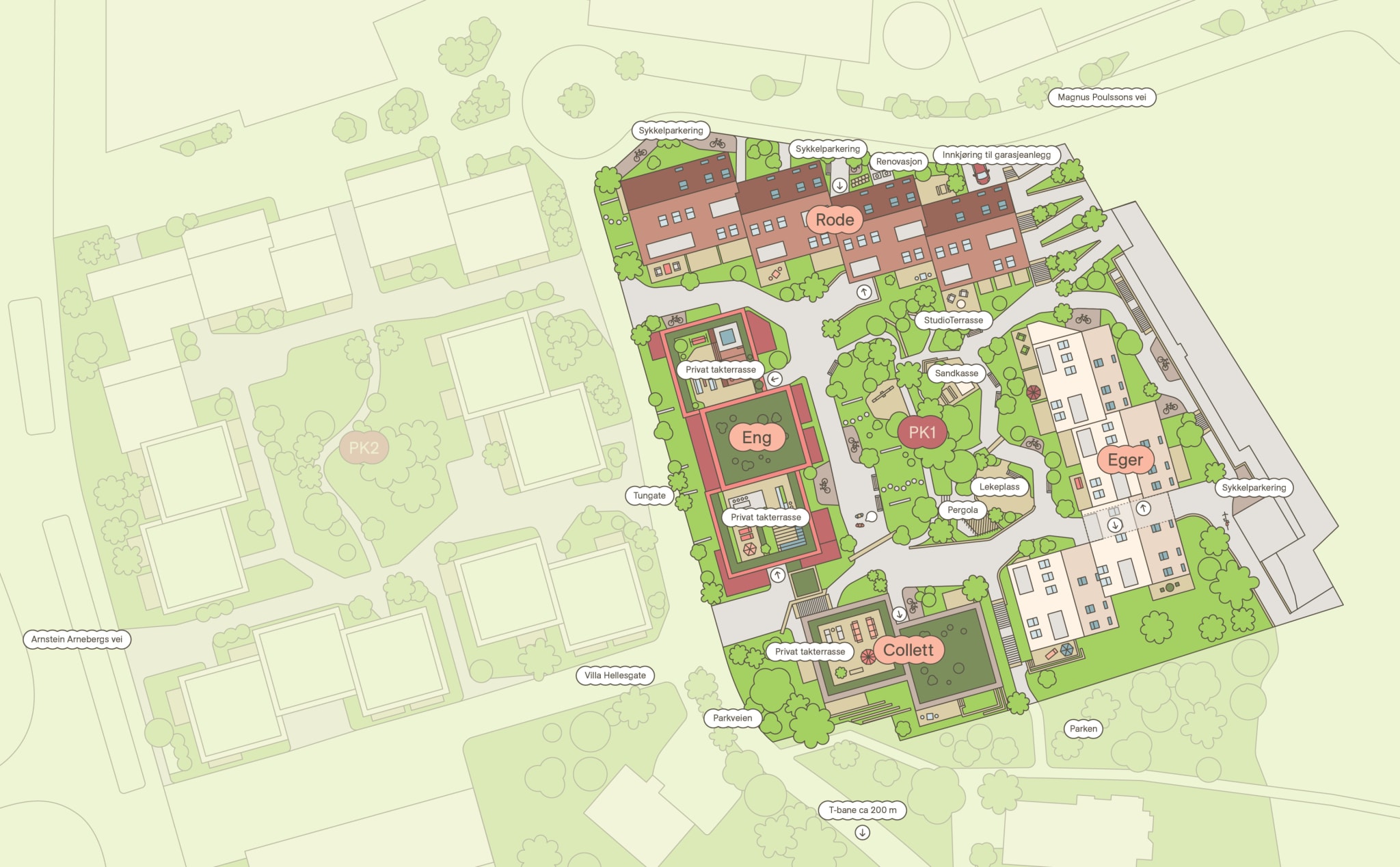 Uteområdene tilbyr fere sosiale soner for sammenkomster og felles aktivitet, men like fullt skjermede steder for egen aktivitet og ro. Byggene som omkranser gårdsrommet har fått navn etter noen av Magnus Poulssons arkitektoniske verk.